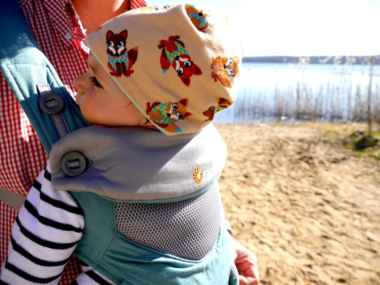 Für ihn muss es vor allem schnell und einfach in der Handhabung sein. Trage umgeschnallt, zack, kann los gehen. Und bitte keine grellen Farben. Das türkis ist zwar hell (er trägt am Liebsten freundliches schwarz), aber Unisex und auch für Männer und ihre Outfits geeignet. Er mag es jedenfalls gern schlicht und bequem. Das erfüllt diese Trage.